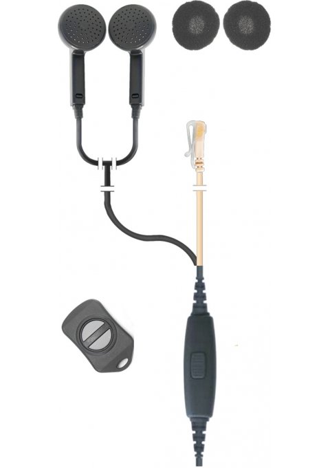 - wersja z przewodowym PTT i rozgałęziaczem; z wbudowanym mikrofonem kamuflowanym oraz złączem 3,5mm do dowolnych słuchawek (bez mikrofonu)